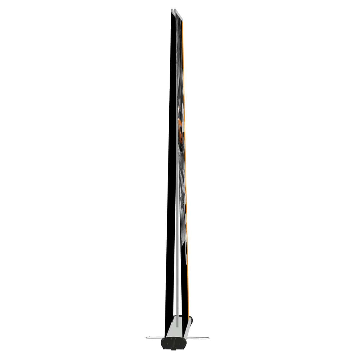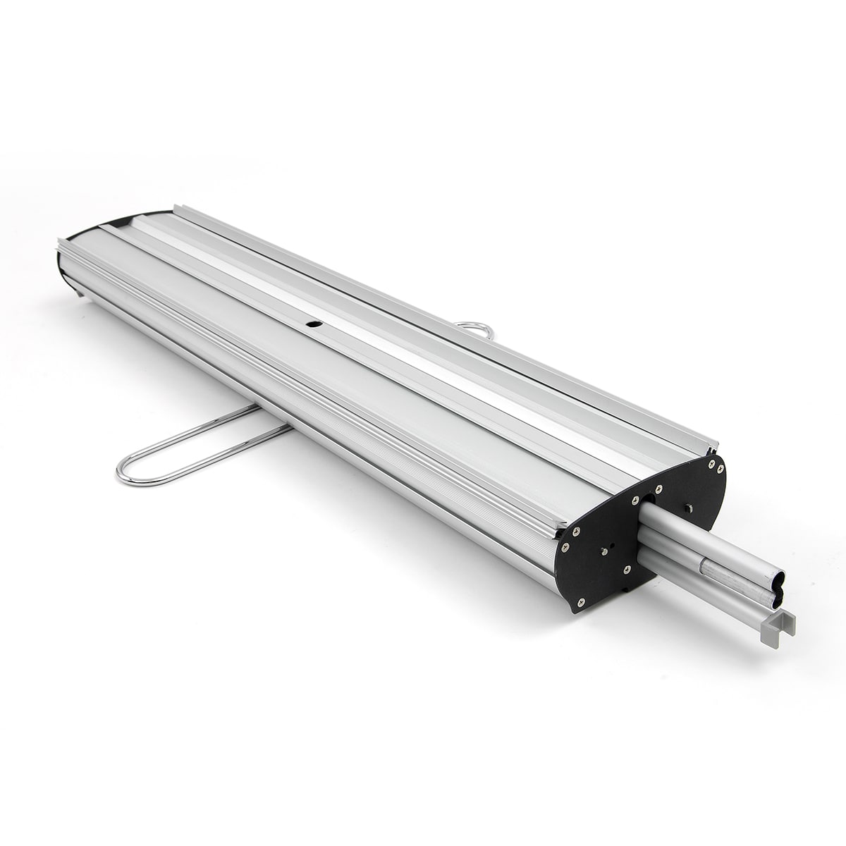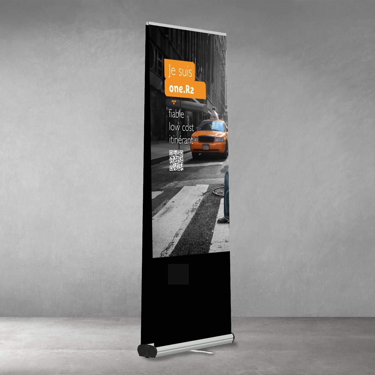 Tout-en-un, one comprend un carter compact et léger en aluminium, un pied stabilisateur escamotable, deux visuels imprimés sur notre matériel anti-curl. Un enrouleur qui passera à travers le temps dans sa housse de transport.