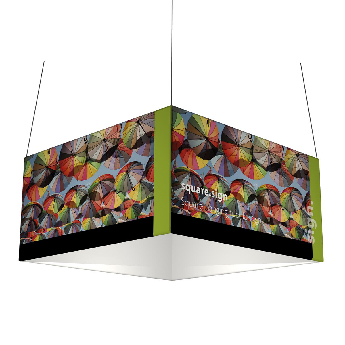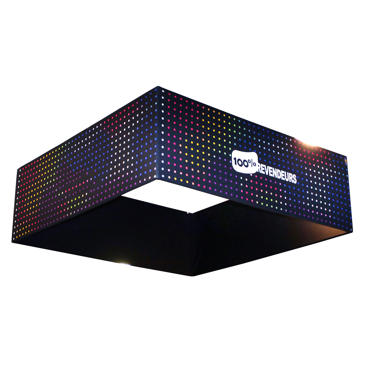 Enseignes élinguées réalisées en structure tubulaire en aluminium anodisé avec un habillage en tissu extensible recouvrant la structure dans sa totalité.