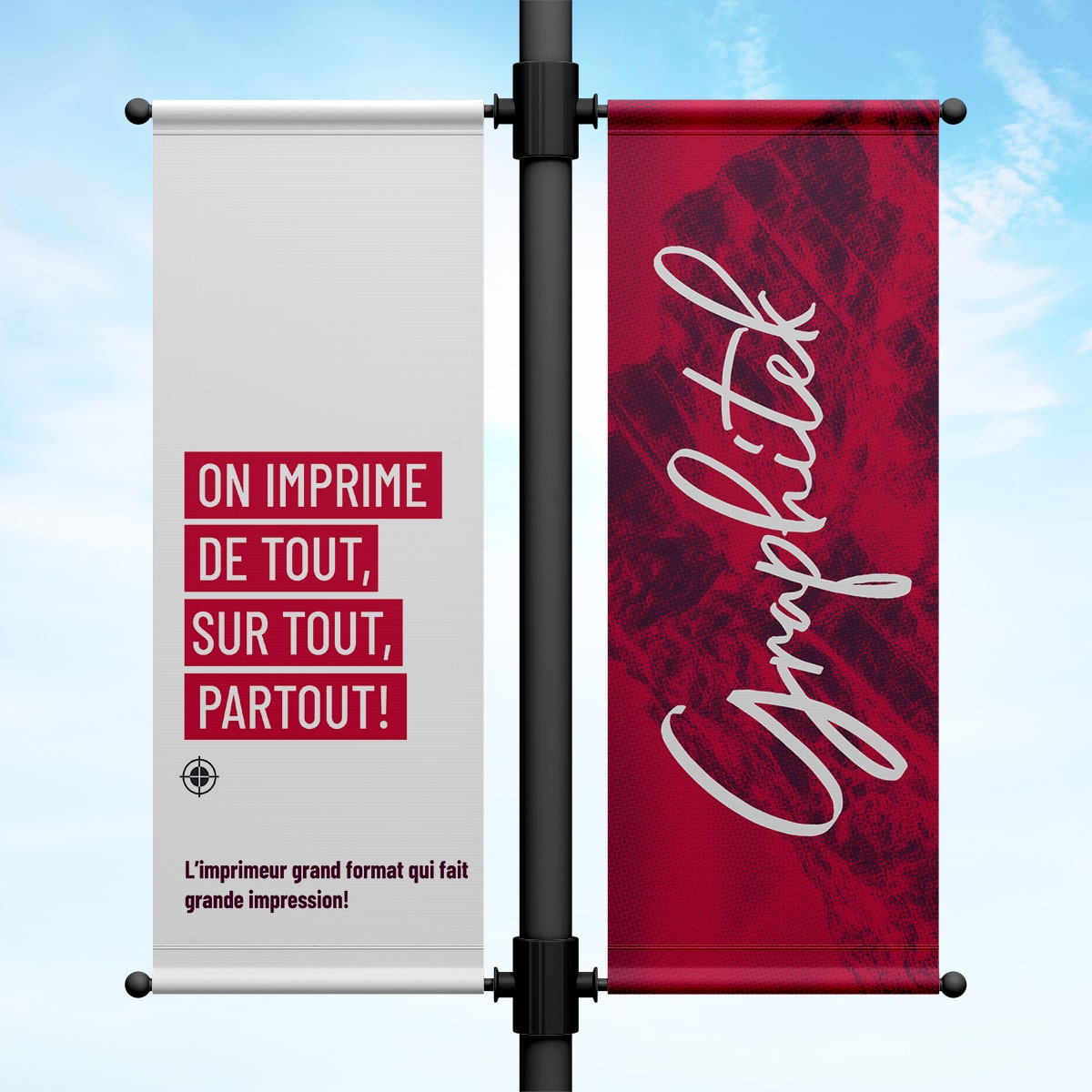 Les oriflammes sont des visuels fixés d’un côté ou de l’autre d’un poteau de circulation pour afficher un événement, un logo d’entreprise ou un message. La répétition sur une même rue augmente l’impact et se mélange bien à l’environnement. Souvent vu en bordure de rue, de pistes cyclable, de jardins…