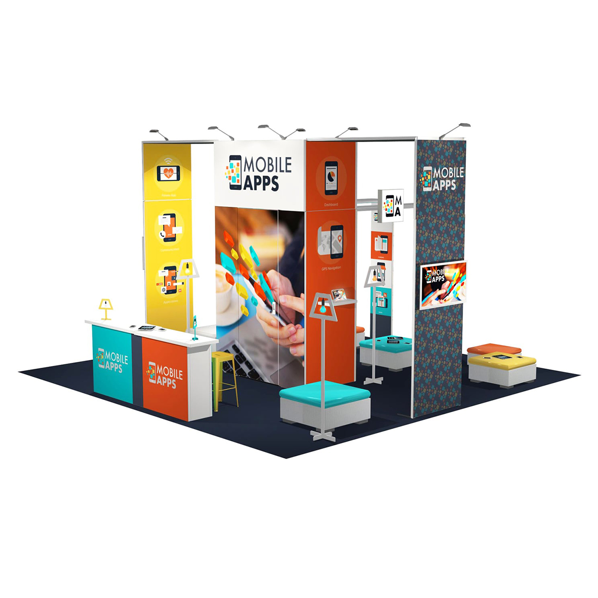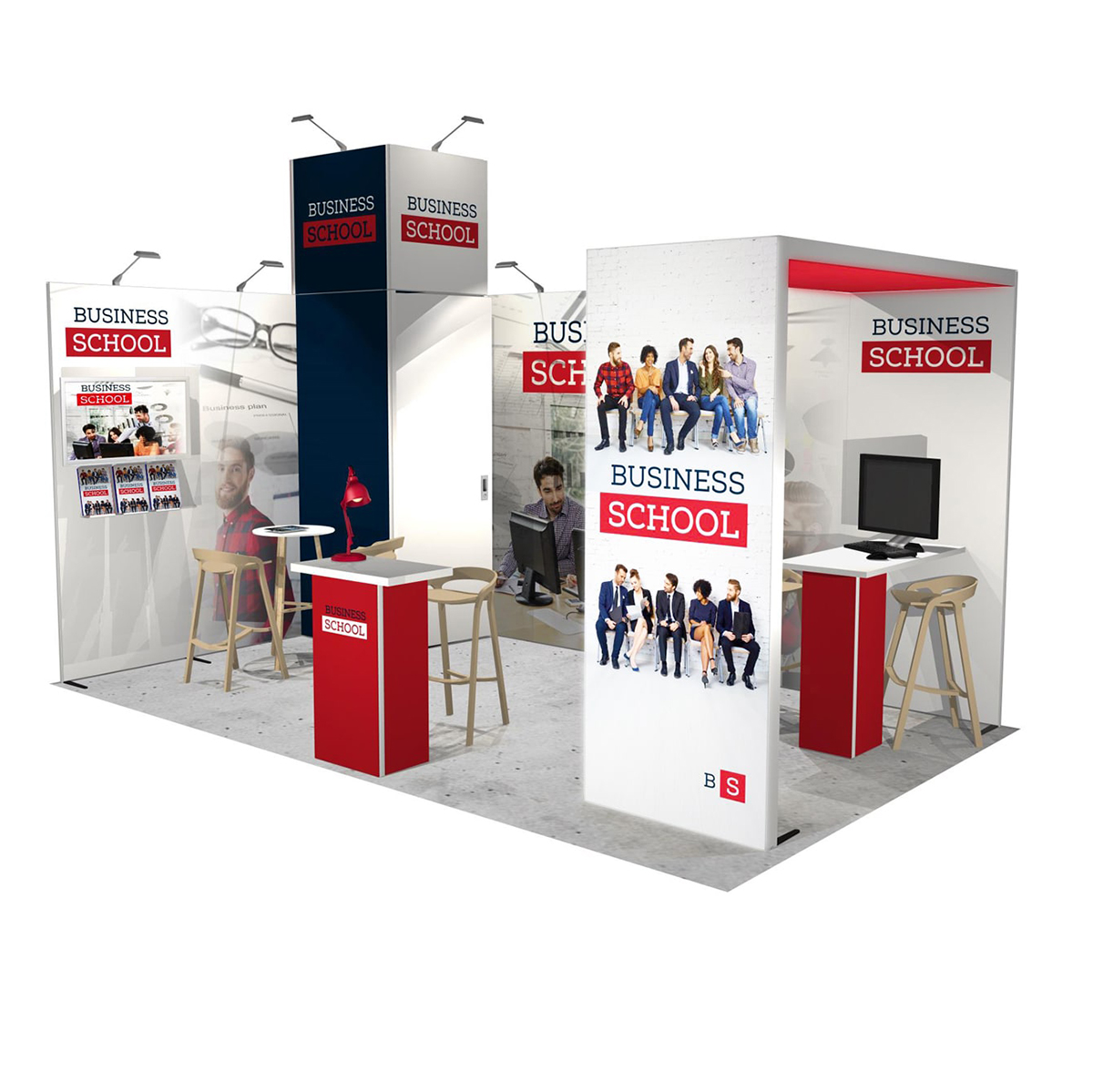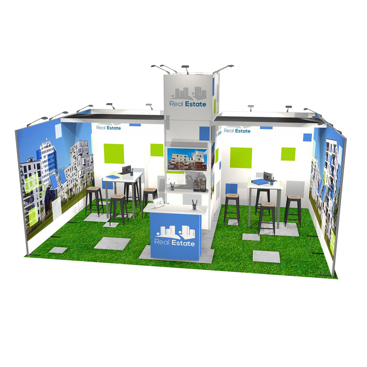 – Différents modules : lumineux, étagères, multimédias, accessoires, crochets, porte-brochures, arches, etc.